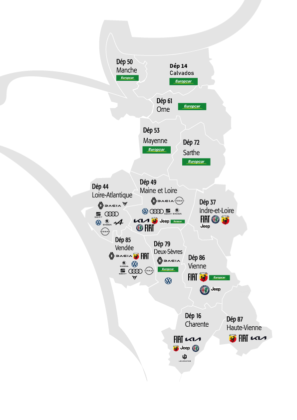 L’histoire commence à Cholet en 1982 avec l’acquisition de notre toute première concession : Renault Cholet. Aujourd’hui, le Groupe Jean Rouyer regroupe 65 sites et 12 agences Europcar, dont une multitude de points de vente agréés par les plus grandes marques. Le Groupe Jean Rouyer représente 15 marques dans l’Ouest de la France. De La Manche à la Vendée, en passant notamment par Limoges, Poitiers, la Charente… Découvrez nos grandes marques : Renault, Dacia, Alpine, Nissan, Volkswagen, Audi, Seat, Cupra, Skoda, Fiat, Alfa Romeo, Jeep, Kia, Abarth et Leapmotor.
